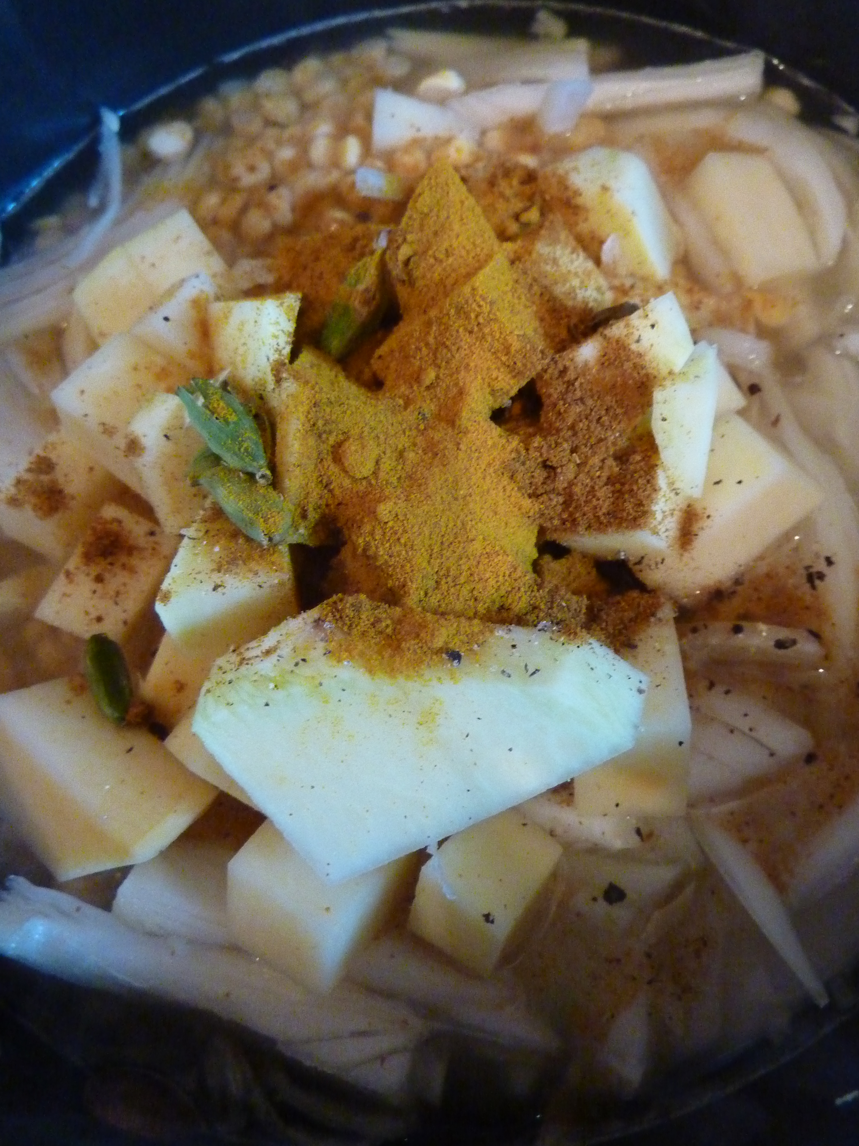 2 cups of yellow split lentils (any lentils will do really, soaked overnight in filtered water), 1 big onion (chopped into small pieces), some root veg (we used one large potato, and half a swede and 1 carrot, also using parsnips, sweet potato etc would all be grand.  Chopped into small chunks).