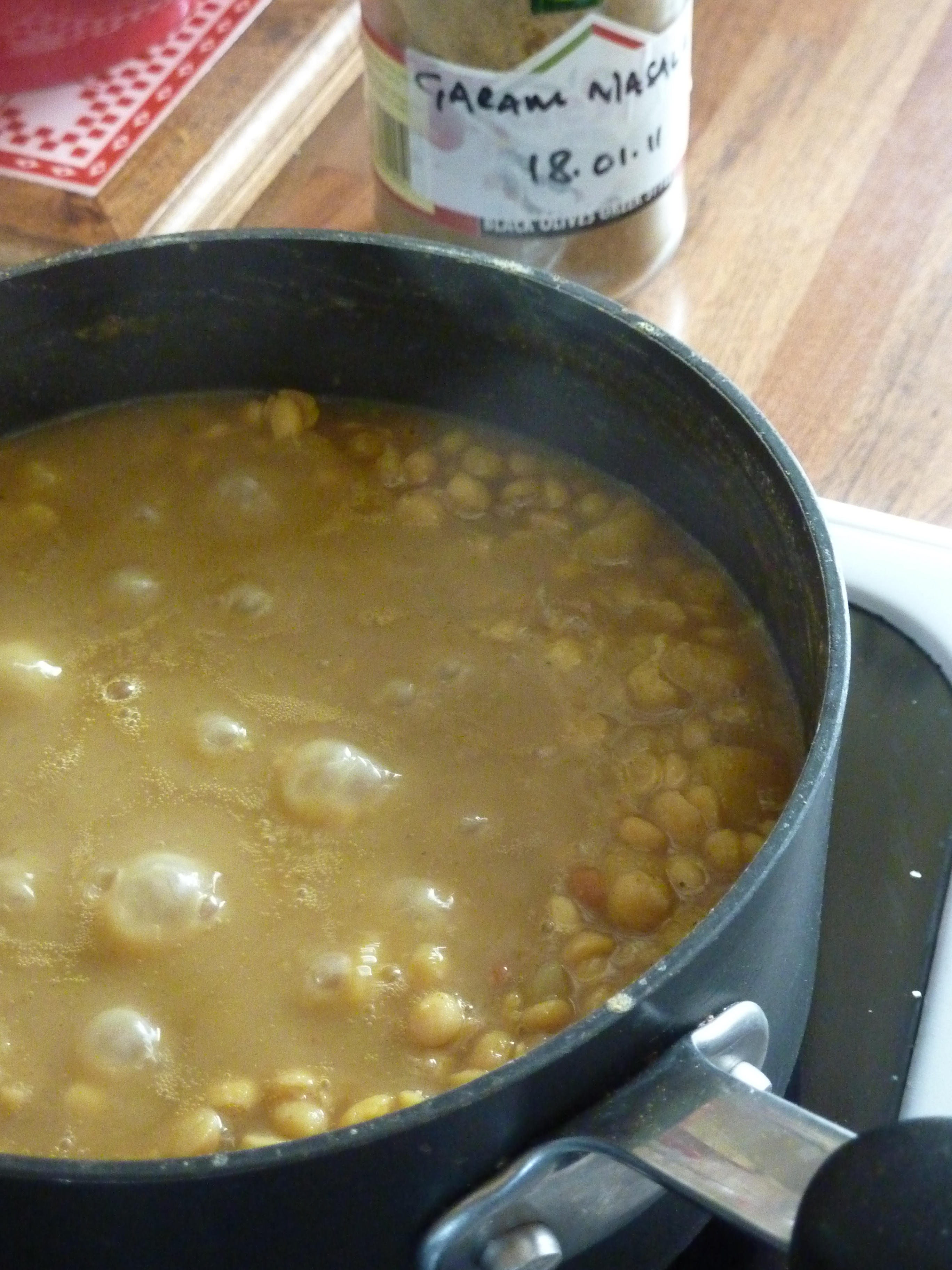 Cooking daal is so simple and I’ve made it even simpler.  I have cut out the steps of frying the onions and spices etc and fast forwarded straight to whacking it all in the pan and bubbling the stew until it becomes thick and gooey.  It saves on washing up at least.  This is a basic recipe and is wide open to bits being added and spices thrown in.