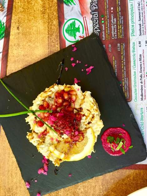 We sampled a variety of vegan treats all over Andalucia. Here’s some delicious Smoked Lebanese Aubergines bound together with tahini.