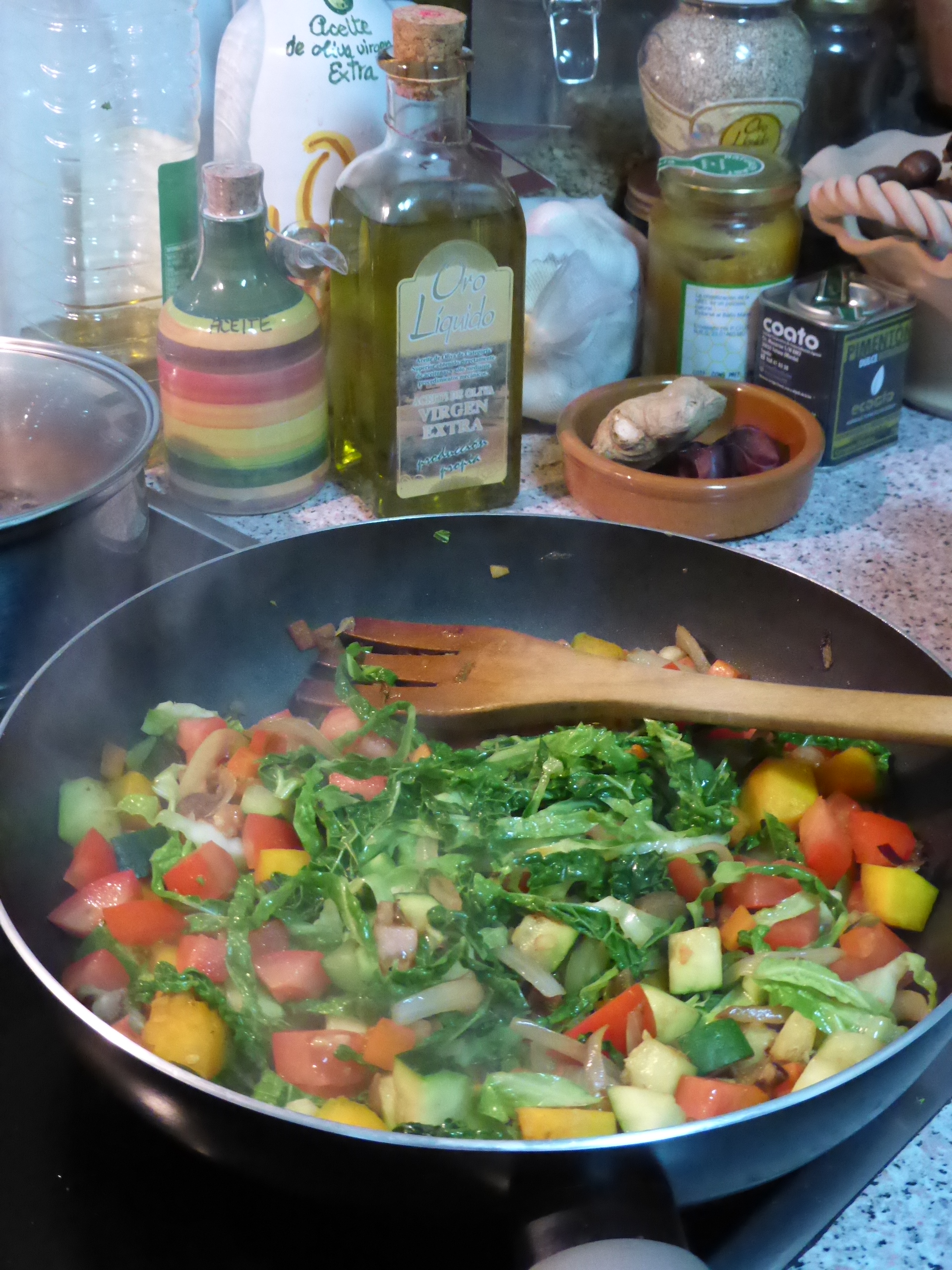 Now add the squash and peppers, the vegetable stock, 1/2 teas sea salt and coconut milk, bring to simmer and cook the vegetables for 8-10 minutes until the veg is soft.