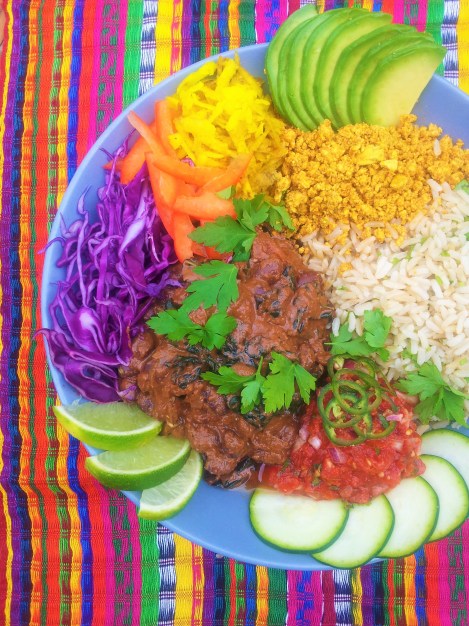We love this kind of curry bowl! So many colours and textures, served with chilli pickle and warm flatbreads, it’s an Indian Thali feast and easy to prepare.