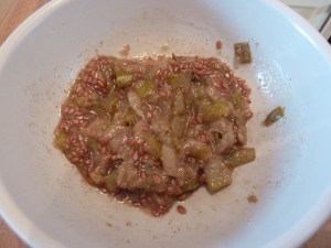 In a baking dish (approx 10″ by 8″), spoon in the apple sauce and sprinkle over the crumble mix until there is a nice thick layer.