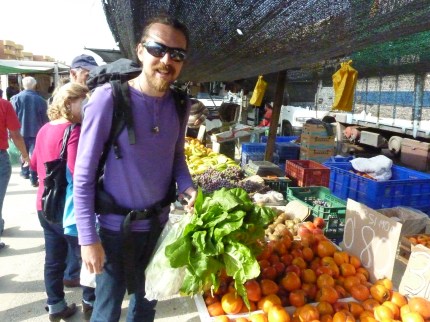 Happy day at the Sunday market (with backpack full of good stuff), Puerto Mazzaron, Spain