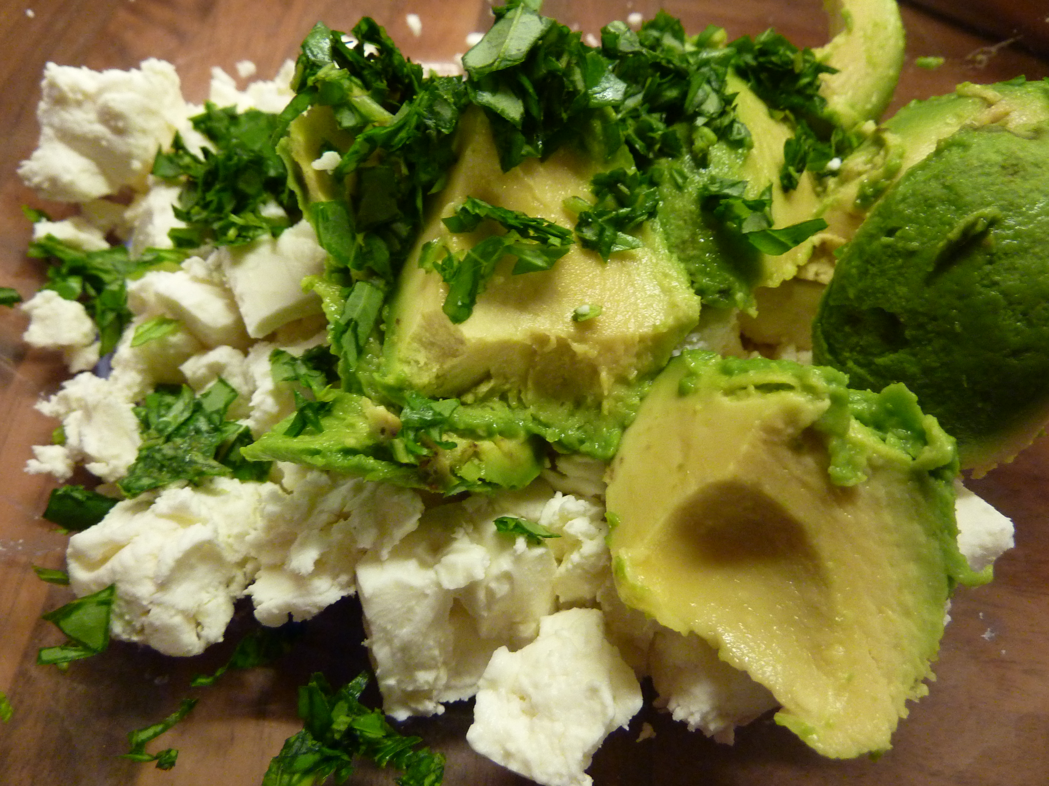 1 avocado (Haas is best), 1 block of tofu or feta, 1/2 lemon (juice only), 10 basil leaves (finely shredded), 1 tbs nutritional yeast flakes (if using tofu)