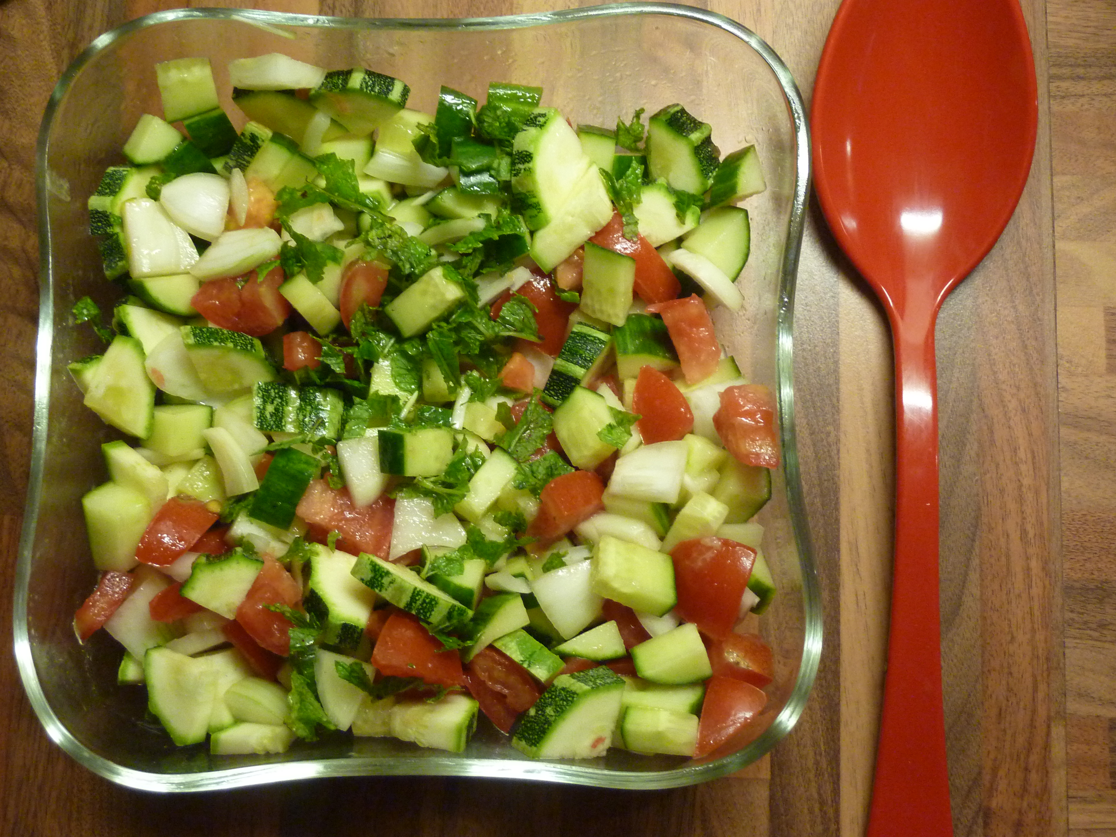 3 medium sized cucumbers, 3 small firm tomatoes, 1 courgette, 2 small sweet onions, 3 tablespoons good olive oil, juice of 1 lemon or lime, 1 handful of fresh mint (chopped, dried mint will do), sea salt and cracked pepper to taste